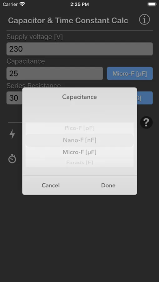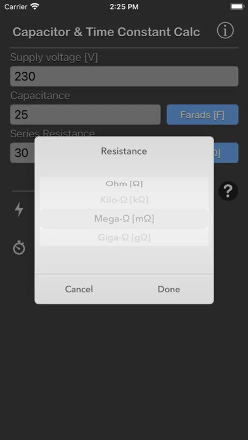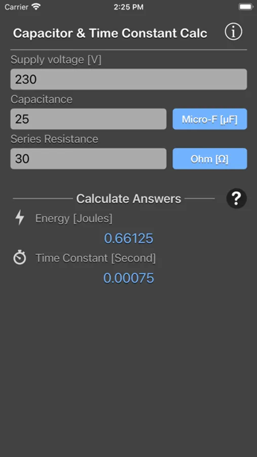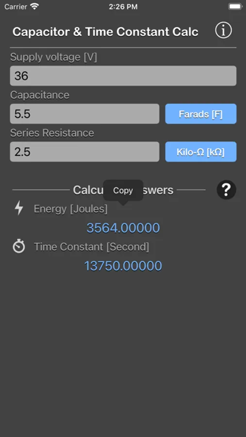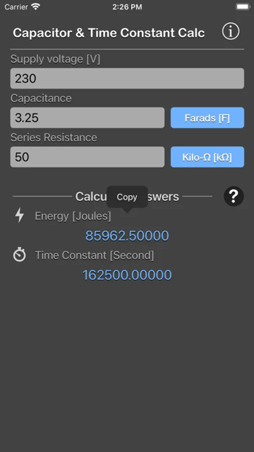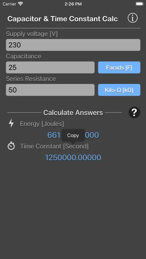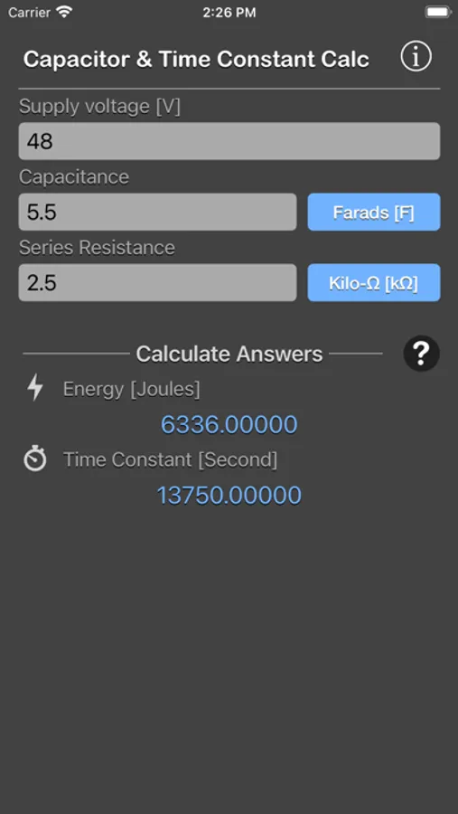 - Energy stored on a capacitor (E) can be determined by giving all three inputs: voltage (V), capacitance (C) and load resistance (R).