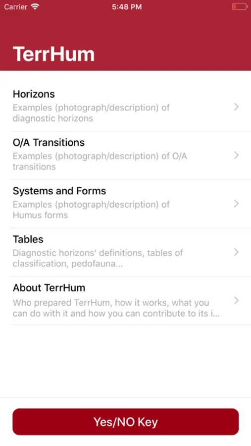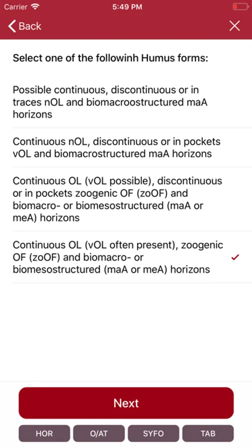 Let us consider a user faced with a soil profile to be classified. A cubic volume of 50×50×50 cm is generally sufficient for studying humus systems and forms in a forest environment, while a larger hole or many well-distributed small holes are necessary for surveying a heterogeneous area. As a humus form is made of superposed humus horizons, the app asks the user to indicate one-by-one which types of humus horizons are present in the observed profile. The user is asked to answer a series of YES/NO questions. He can use the touch-buttons for help and display examples of horizons, types of transition or humus systems, as well as forms and tables of composition/classification of humus horizons, or groups of animals and droppings. At the end of the survey, a photograph of the target humus form appears, along with a list of the chosen horizons.