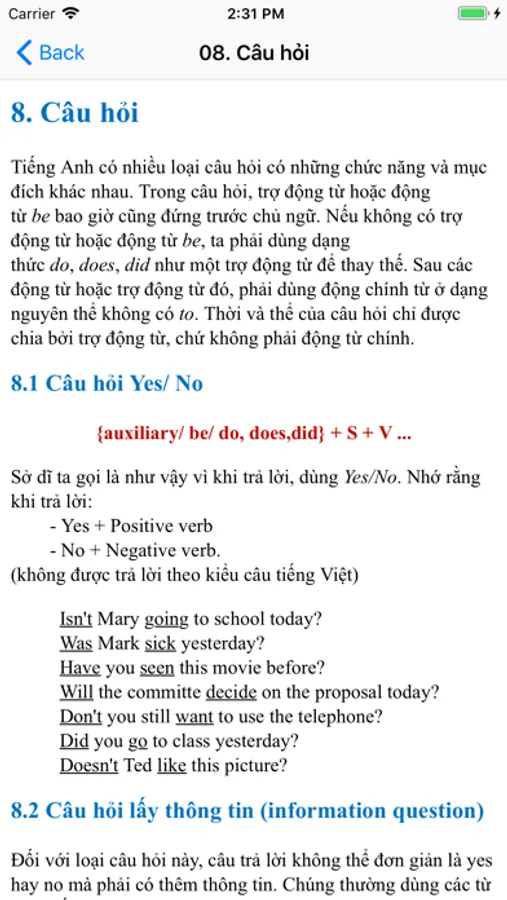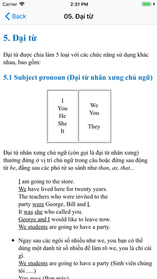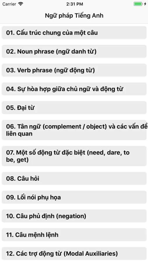 * Ứng dụng giúp bạn luyện ngữ pháp tiếng anh một cách thành thạo, ứng dụng phân loại mục lục rõ ràng dễ hiểu và dễ nhớ, giúp bạn mau chóng ôn lại kiến thức ngữ pháp đã quên vốn có.