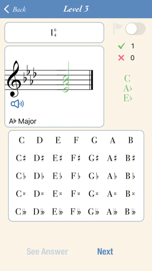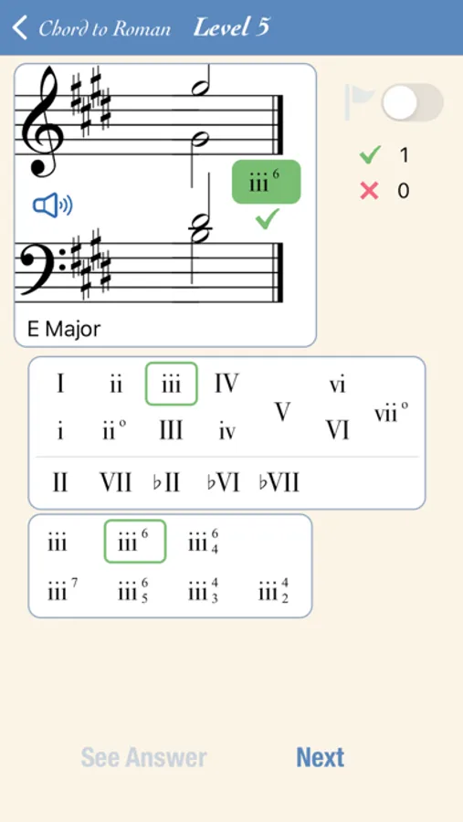 - Training on selecting a correct Roman numeral for a given chord displayed on the music sheet