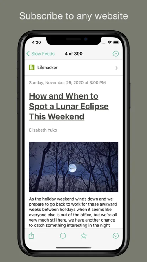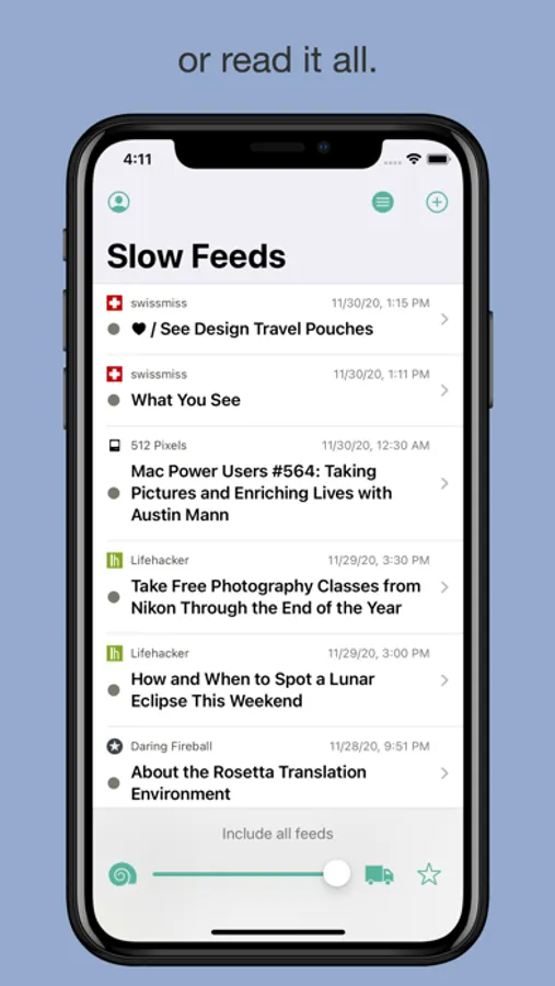 If you have an account on Bazqux, Feedbin, Feed Wrangler, FeedHQ, Feedly, Inoreader or Newsblur you can access it with Slow Feeds. Or you can use it as a standalone app.