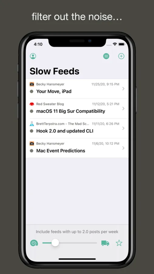 Slow Feeds lets you subscribe to any and any number of those feeds, lets you star your favorite articles, mark them as read or unread, or unsubscribe from feeds again.