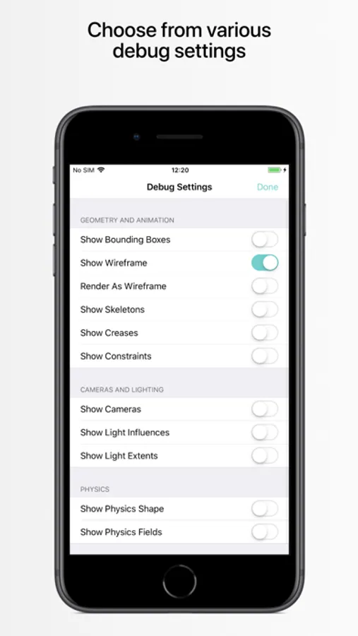 • Choose from various debug settings to help trouble shoot your scene (e.g., display wireframes, bones, cameras)