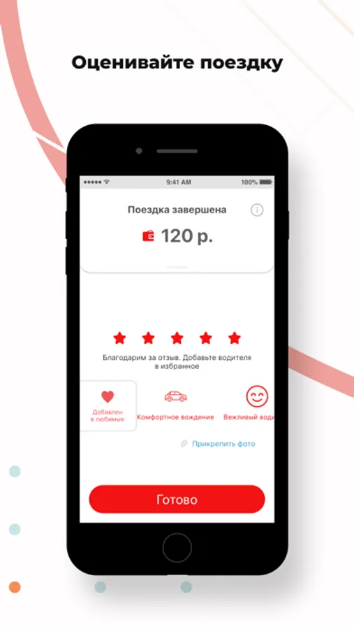 Оценивайте поездку с помощью готовых шаблонов. Занесите водителя в “Избранные”, если понравилась поездка, или поблагодарите его чаевыми.