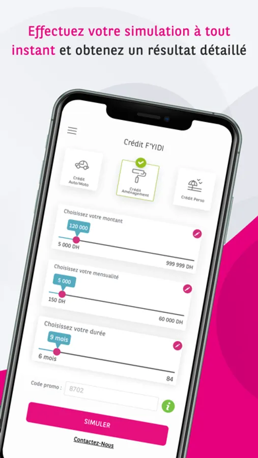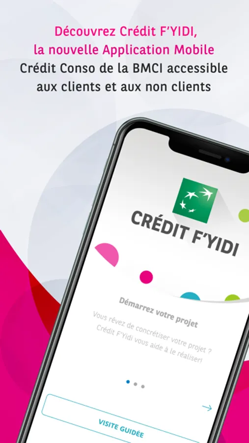 Découvrez l'Application Mobile Crédit F'Yidi qui vous accompagne dans la réalisation de vos projets personnels! Que vous soyez clients BMCI ou non clients, l'Application Crédit F'Yidi vous permet d'effectuer vos simulations de crédit en toute confiance et vos demandes de votre crédit en ligne en toute sécurité.