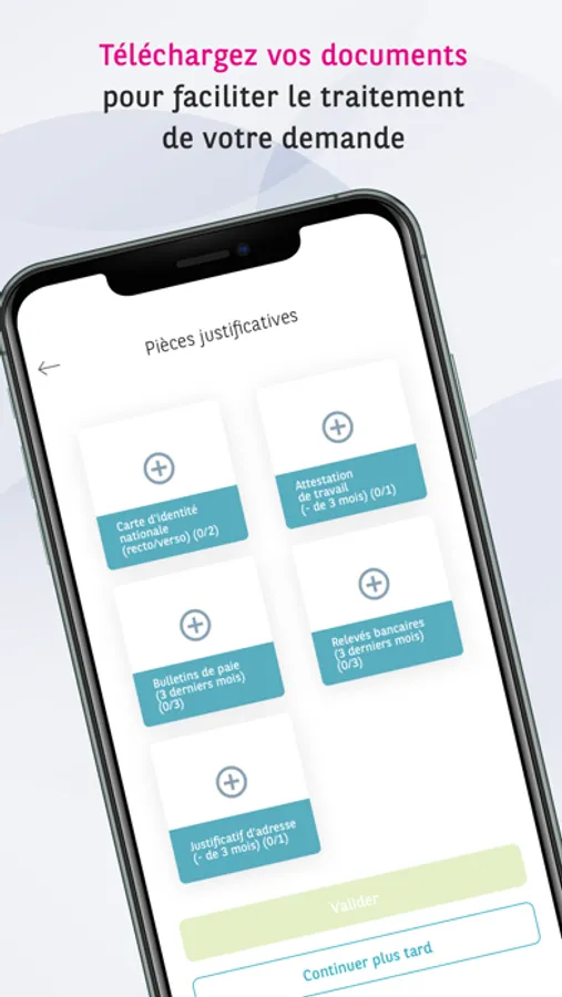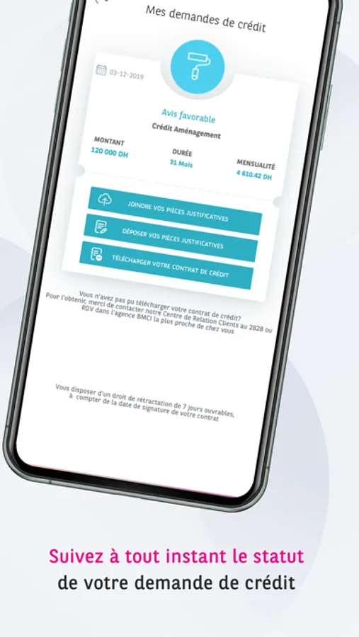 Saisissez en quelques secondes votre RIB et téléchargez votre contrat de crédit immédiatement! Munissez vous des pièces justificatives demandées et scanner les directement avec votre mobile afin d'optimiser le traitement de votre dossier. Vous n'avez pas toutes les pièces justificatives sur vous? Pas de soucis, choisissez l'agence BMCI de votre choix et munissez-vous de vos documents originaux pour finaliser votre demande.