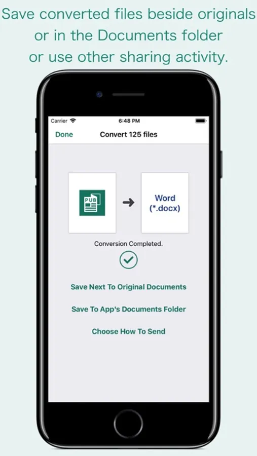 Save to App’s Documents Folder - Tap this button to save a converted file with unique name with target format extension into “PUB Converter” Documents folder.