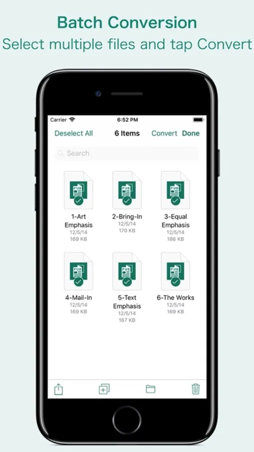 “PUB Converter” supports batch conversion. Select multiple PUB files in document browser view and tap Convert button at top to start batch conversion.