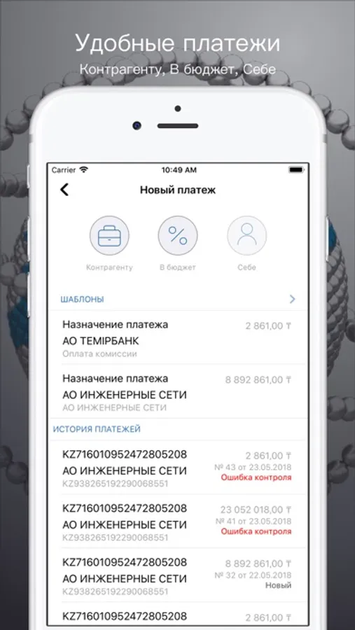 • Быстрый повтор платежа из шаблонов или истории платежей
