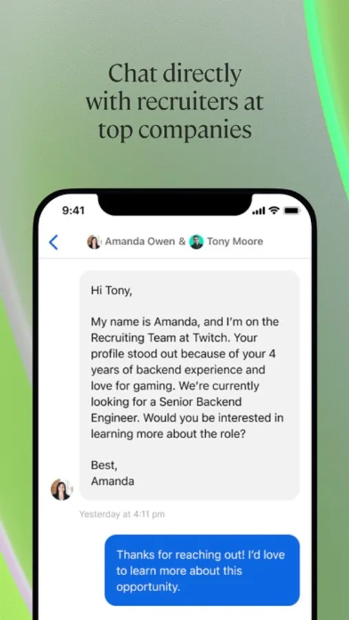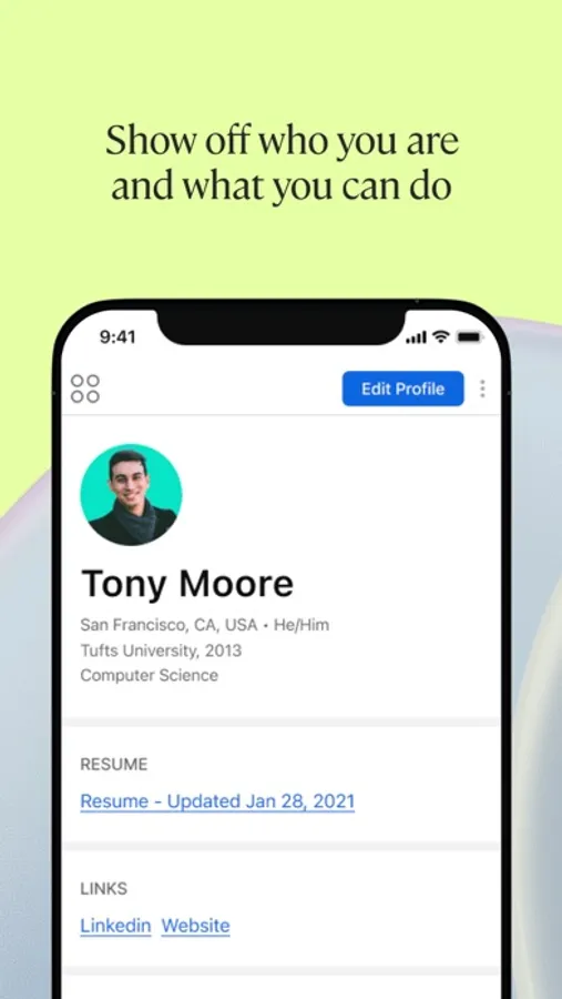 Add interests, side projects, demographic data, and past experiences to your profile to get matched with companies that align with your values. Once they review your profile, recruiters can reach out to you directly to start the hiring process.