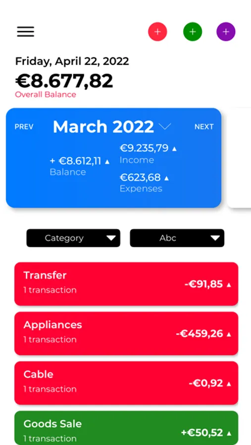 - Dashboard for current month activities where transactions are sorted according to your preferences (category, date, amount|)
