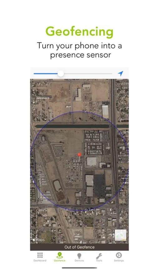 - Define a Geofence for Mobile Presence detection based on phone location. The Geofence center defaults to your hub location but can be dragged to any location and the radius set.