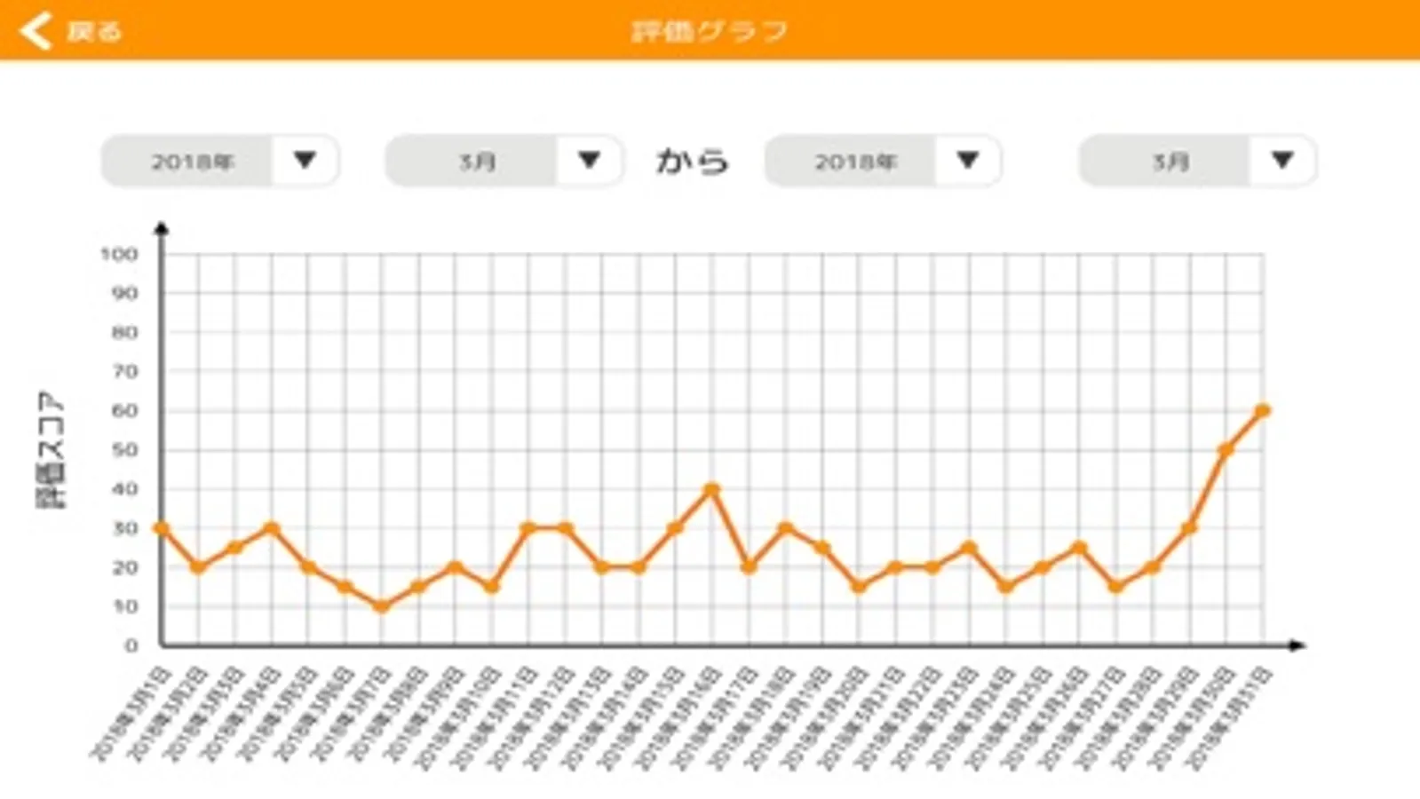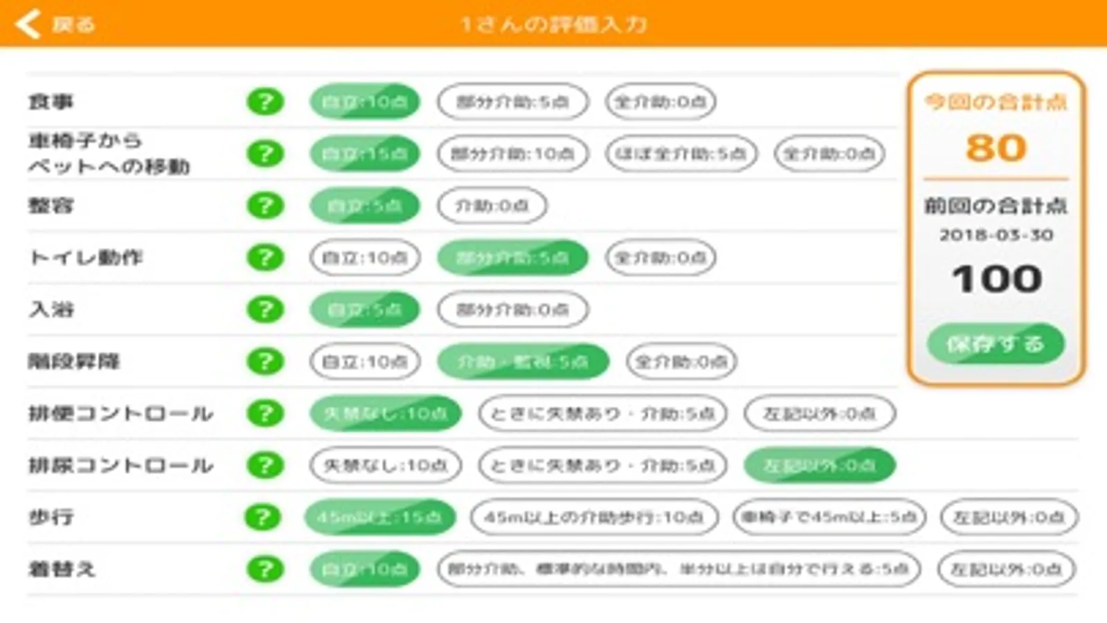 ○バーセルインデックス全10項目の点数を記録し、評価点数の推移をグラフで表示します。