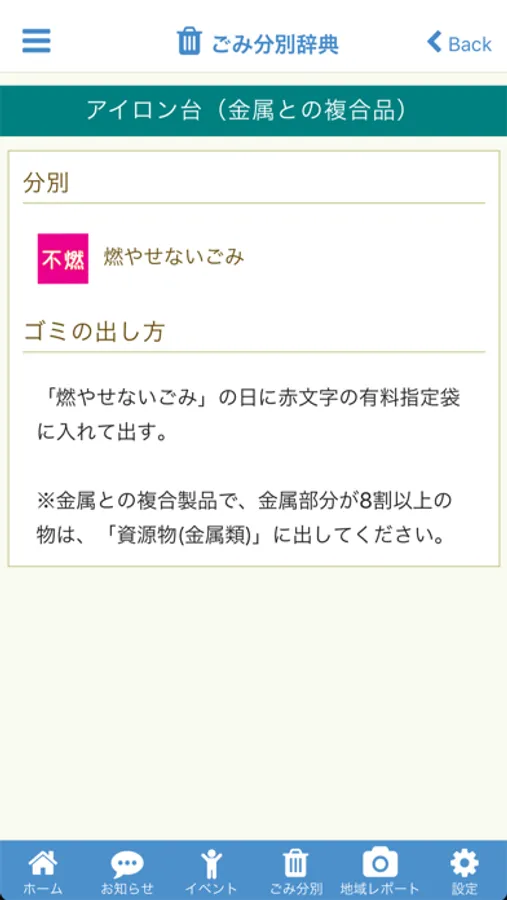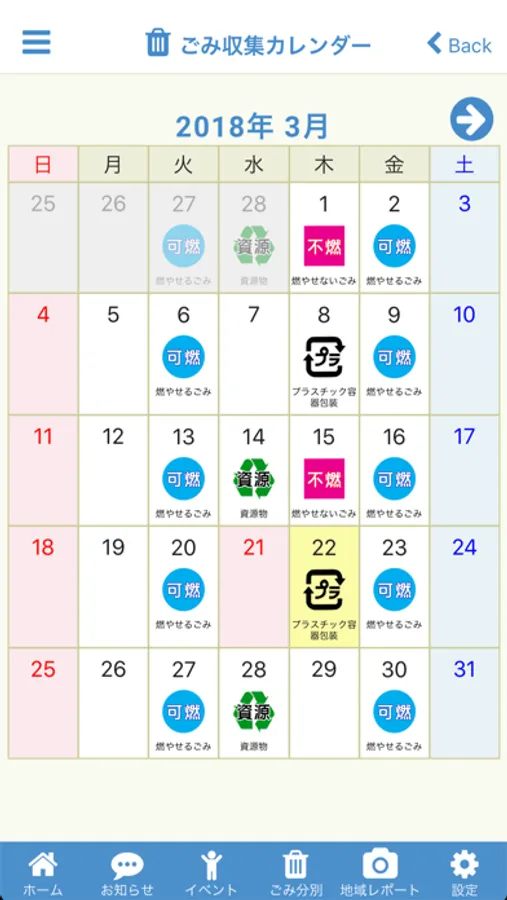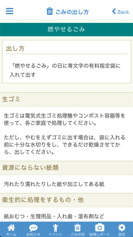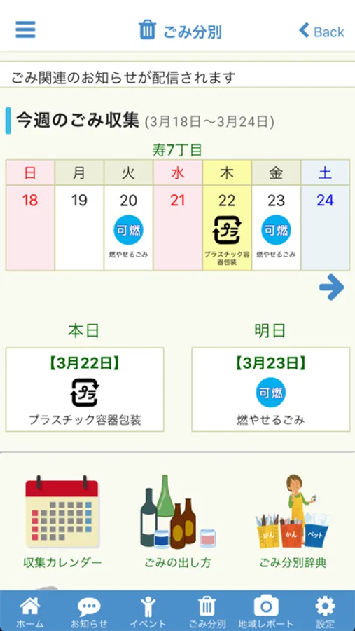 お住まいの町内会を設定することで、収集ごみの種類や収集日を簡単に確認できます。