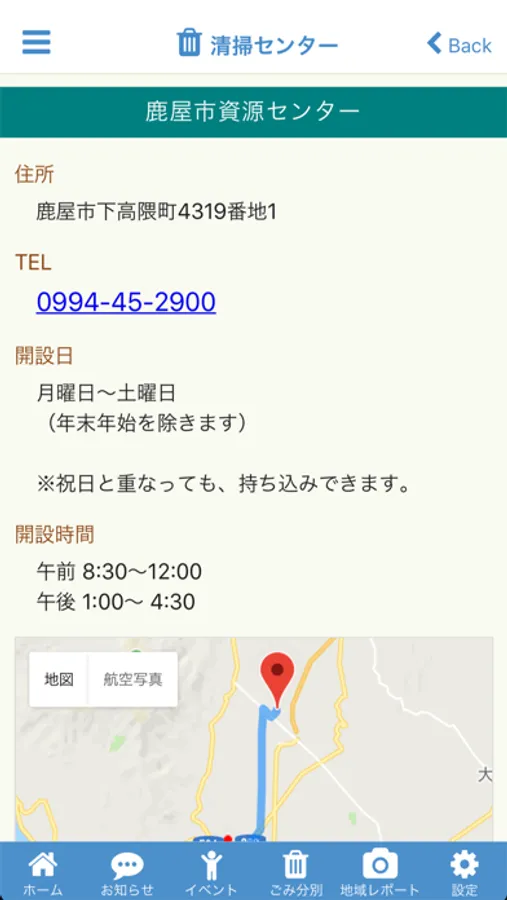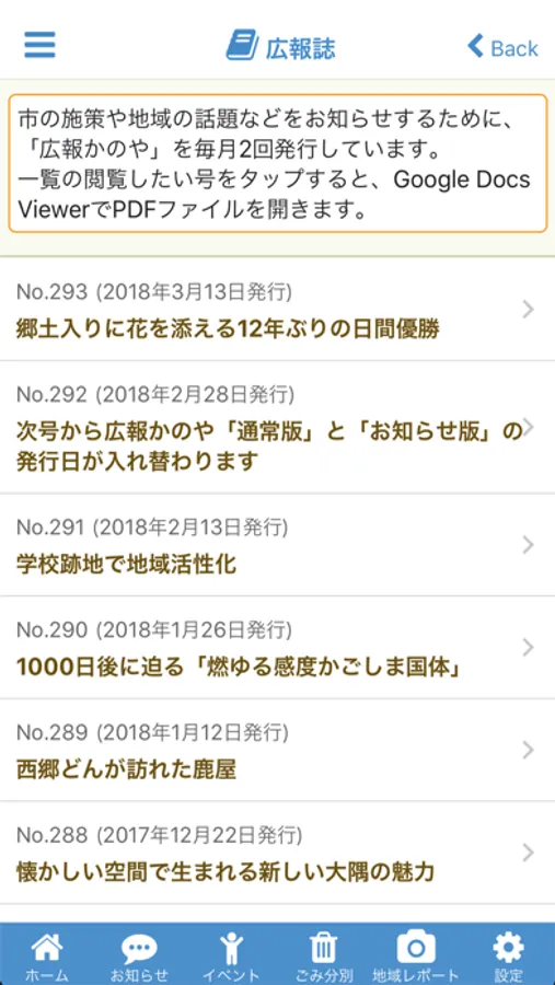公式アプリでは、市のお知らせ・イベント情報を受け取ることができます。また、お住まいの地区のごみの収集予定の確認や、捨てたいものからごみの種類を検索、道路の破損やごみの不法投棄など地域レポートを市へ投稿することができます。