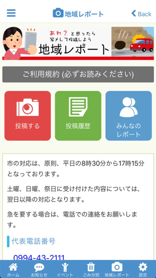 道路の破損やごみの不法投棄等について、地図上の位置や写真付きの情報を鹿屋市へ送信(地域レポート投稿)することができます。