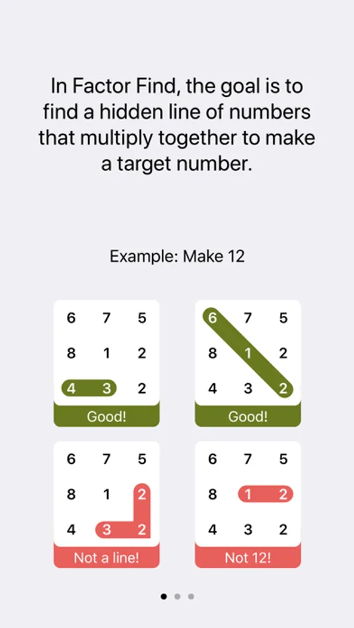 Inspired by the classic Word Search and Sudoku games, Factor Find is a puzzle game about math! The rules are simple: solve puzzles by making target numbers with factors on the board. For example, make 12 from 4*3 or 2*6.
