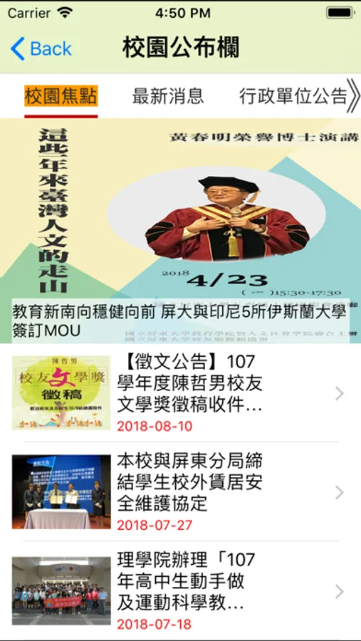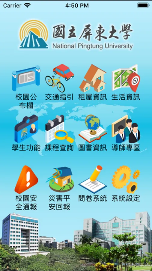 本APP提供教職員生及訪客安全並便利的取得資訊或進行相關作業,並提供圖書資訊、校園安全通報、災害平安回報等主要功能。