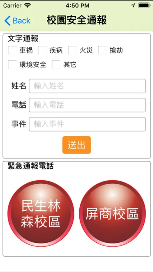 4. 主動關心師生平安,利用[災害平安回報]功能,當發生大型災難時,校安中心主動通知居住地位於受災區域之師生透過APP回報自身安全或受傷狀況。
