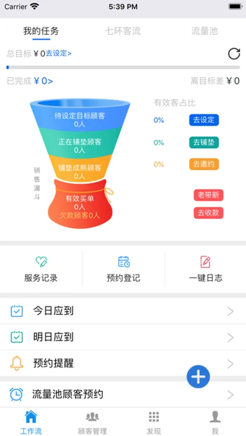 将美容师日常要做的工作整合为8项工作流,今日应到、明日应到、预约提醒、关心日祝福、流量池顾客预约、黄红冰激活、回访记录、一键日志,工作流程和完成进度一目了然,提高工作效率。