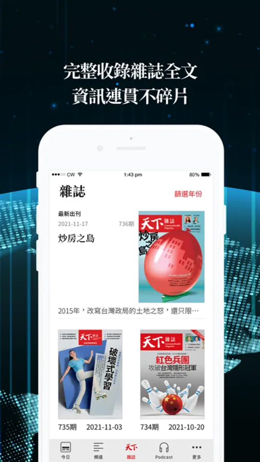 ● 雜誌:資訊碎片化時代,完整收錄《天下》雜誌全文,紙本深度與數位化便利,一次擁有。