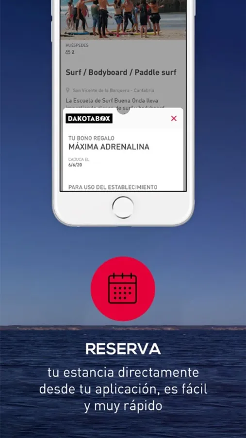 Llama directamente desde la aplicación para reservar, y para las estancias, comprueba la disponibilidad y reserva directamente desde la aplicación. Si deseas cambiar de experiencia, cambia tu caja regalo rápida y gratuitamente desde la App de Dakotabox.