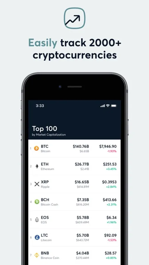 * Monitor 2000+ cryptocurrencies, including Bitcoin, Ethereum, Ripple, Bitcoin Cash, Litecoin, Eos, Cardano, Stellar, NEO, Monero, IOTA, Tron, Dash, Tether, NEM, Binance Coin, Ethereum Classic, VeChain, Qtum, OmiseGO, Verge, Lisk, ICON, Bitcoin Gold, Nano, Zcash, Ontology, Bytom, Steem, Populous, Dogecoin, and Waves.