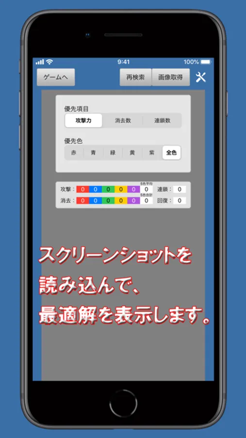 ぷよクエのスクリーンショットを読み込んで、設定した条件に最適な消し方を提示します。※このアプリは個人が作成した非公式アプリです。