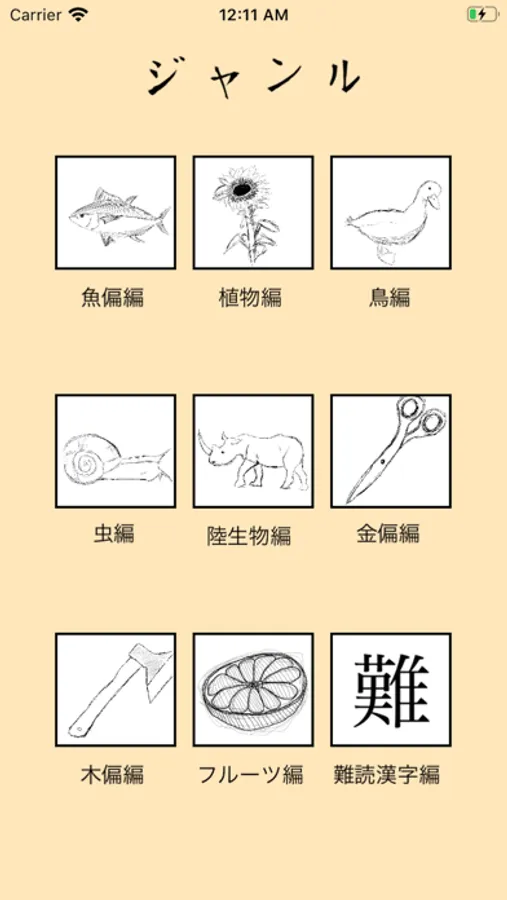 難読な生き物や道具などの漢字をクイズ形式で学習することができます。