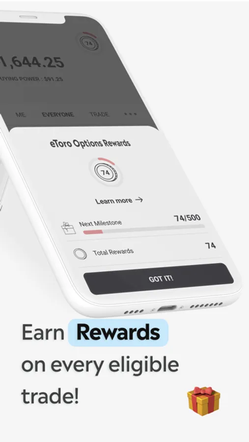 eToro Options allows users to earn rewards when they sign up, when they make their first deposit, and with each eligible trade. Customers can then redeem their rewards for cash at the end of each month. Terms and conditions apply.