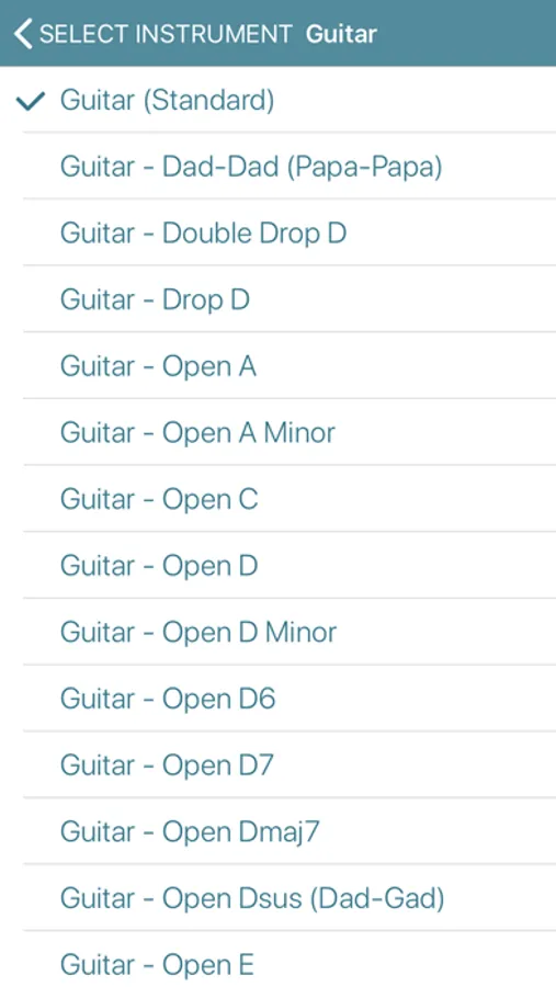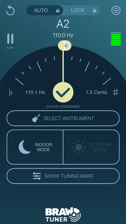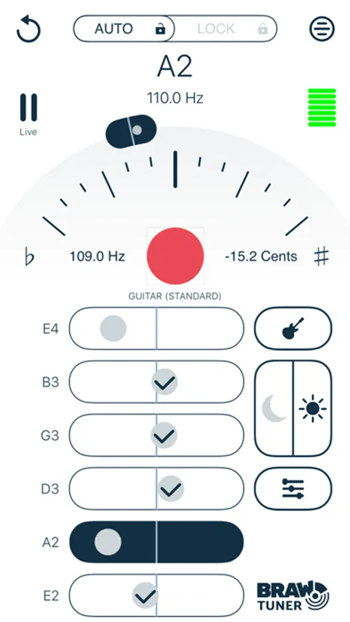 The tuner automatically detects which note you are playing, based on what is the loudest/closest to your devices microphone. The gauge will then clearly indicate how sharp or flat you are compared to the automatically calculated reference frequency for the note.