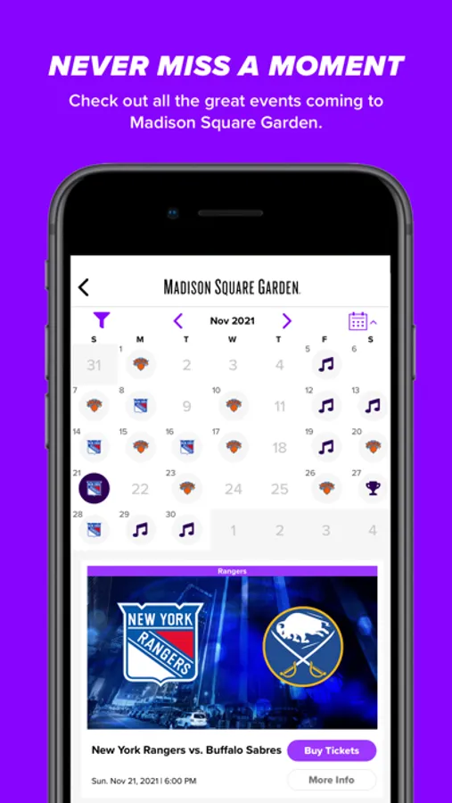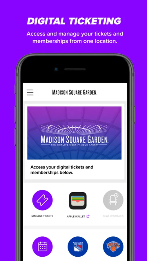 The MSG App is the official app for your visit to the World’s Most Famous Arena! Entering MSG is now fully digital – the MSG App allows you to access and manage your tickets and memberships from one location. You can also discover venue features, plan your visit, view upcoming events through our intuitive calendar, and even book a luxury suite for select events.