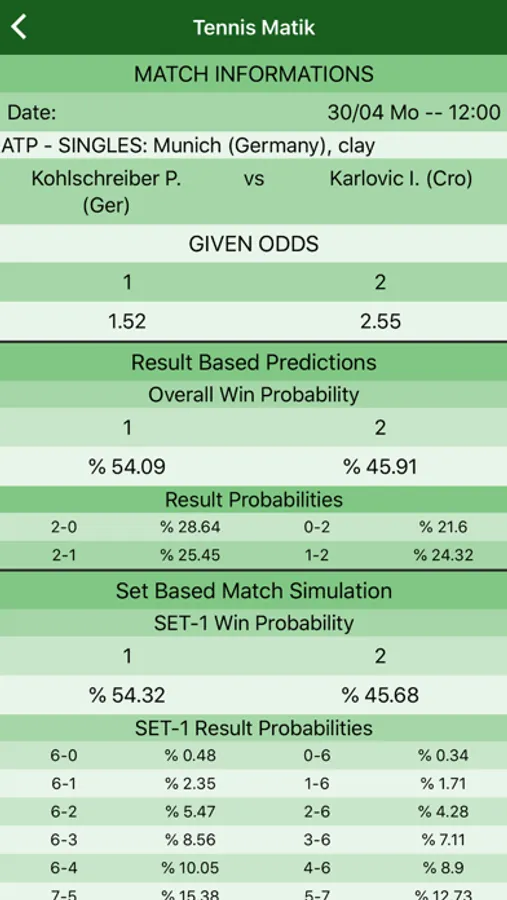 TennisMatik produces two types of estimations based on performance and odds analysis.