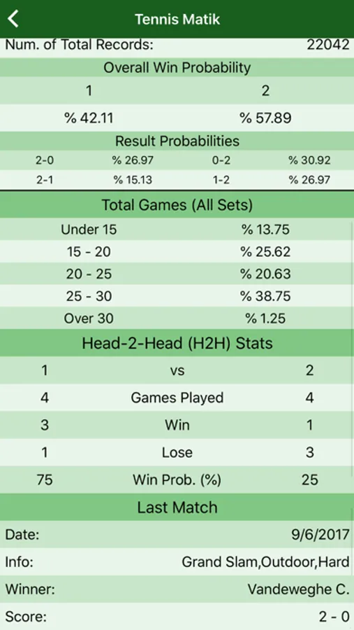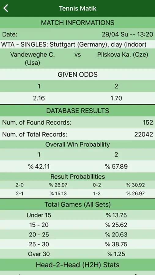 - In addition to odds analysis data, Head-2-Head Stats of the players are also given with their last game result.