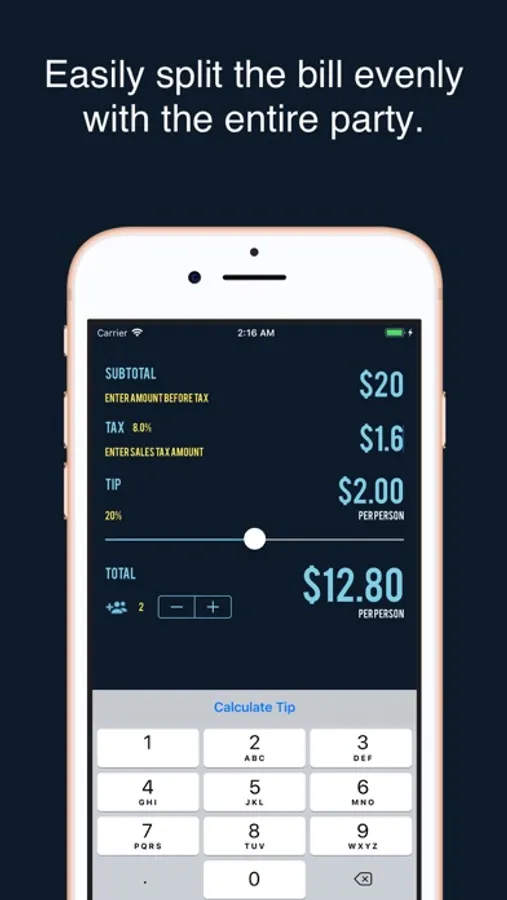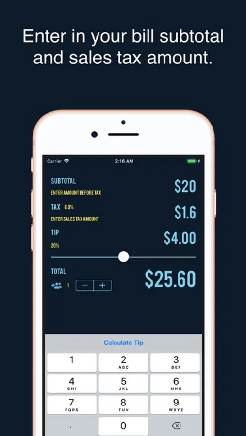The only tip calculator in the app store to handle sales tax regardless of where you are in the United States. Simply input the subtotal and sales tax given to you on the bill, choose the appropriate gratuity percentage, and your tip amount and total are calculated automatically. Everything is calculated for you and presented in an easy–to–read manner, just copy what you see on the screen onto the receipt!