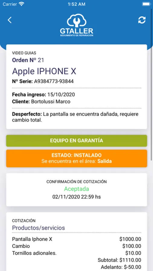 Mediante esta aplicación podrás estar informado de los avances de tu equipo/vehículo que poseas en reparación.