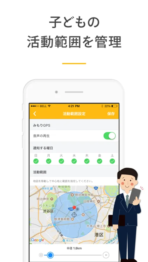 保護者が指定したエリアに入ったときや離れたときに、保護者のスマートフォンアプリへプッシュ通知でお知らせします。また、子どもが持っている「みもりGPS」から音声を再生することもできます。
