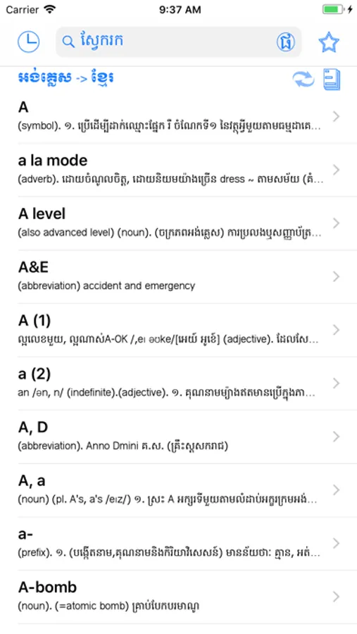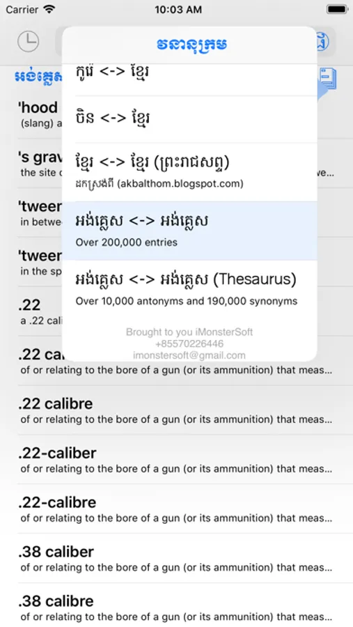 AIO dictionary is a all in one khmer dictionary which can translate from 6 languages to khmer, khmer to khmer and khmer to khmer (Kingwords 'Reach Sab') dictionary. That languages are: