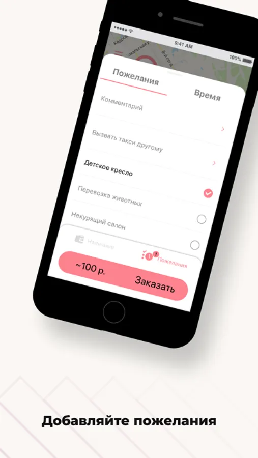 Добавьте к заказу дополнительные пожелания. Например, когда едете с ребенком — выберите "детское кресло". Если вы не переносите запах табака — укажите "Некурящий салон", и к вам приедет некурящий водитель.