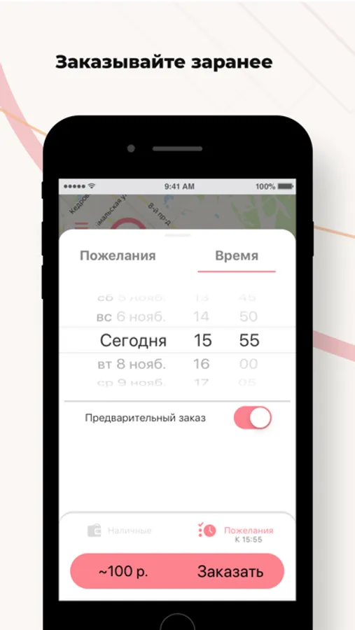 Выберите опцию “Предварительный заказ”. Поиск автомобиля начнется незадолго до заказа поездки, и автомобиль приедет к назначенному времени. Также вы будете заранее знать стоимость поездки.