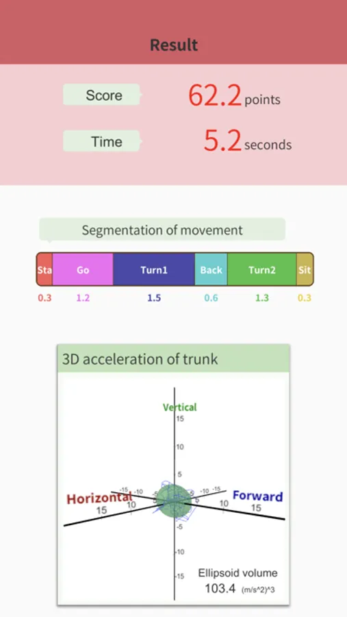 Using the iPhone's accelerometer and gyroscope, data in three axis directions is recorded every 0.01 seconds and analyzed using a proprietary algorithm.