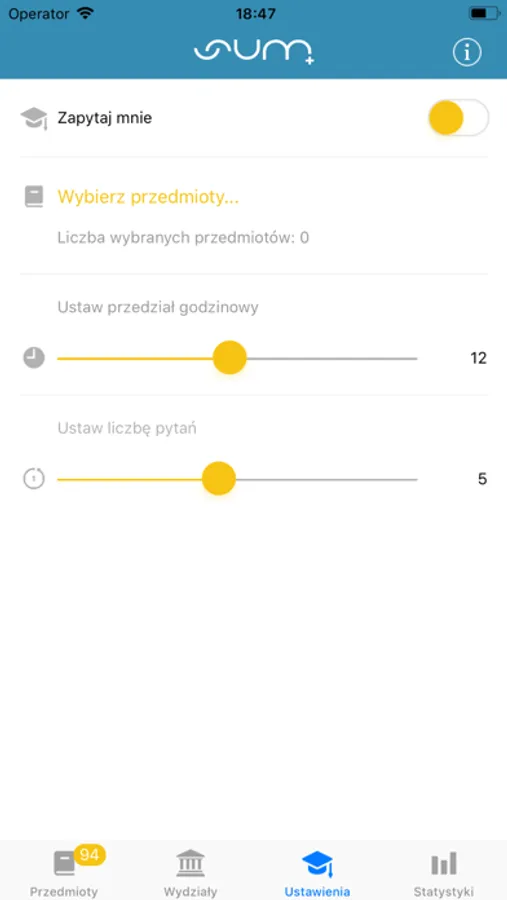 How does it work? To run the application you need to have access to the Internet, since the application needs to synchronise with SUM servers and download questions from the database. Chose the topic you are interested in, define the number of questions and start the test! Can you obtain 100% right answers? Your results can be viewed in the “statistics” tab where all your results are stored so you can see your learning progress. You can also turn on the continuous knowledge test mode. Chose “ask me” window and activate it. Then chose the subject and time interval of the appearing questions (every hour, two hours etc). The questions will surprise you in different places and situations and you will have the opportunity to verify your alertness. If you want this function to work properly you need to turn on notifications for our application in the general settings on your smartphone.