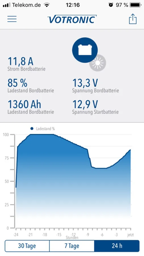 Der Energy Monitor liefert in Verbindung mit dem Votronic Bluetooth Connector S-BC alle Live-Daten des Votronic Solar-Ladereglers (ab 2013) und/oder des LCD-Batterie Computer S bzw. VPC Jupiter mit Smart Shunt.
