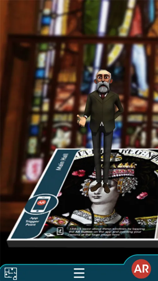 You’ll need to visit the Town Hall to unlock the information. When you get there look out for the AR icons on the interpretation panels around the hall, tap the AR button, point your mobile device at the panel to meet Margaret and Arthur and unlock more about each of the windows and the history of the Town Hall.