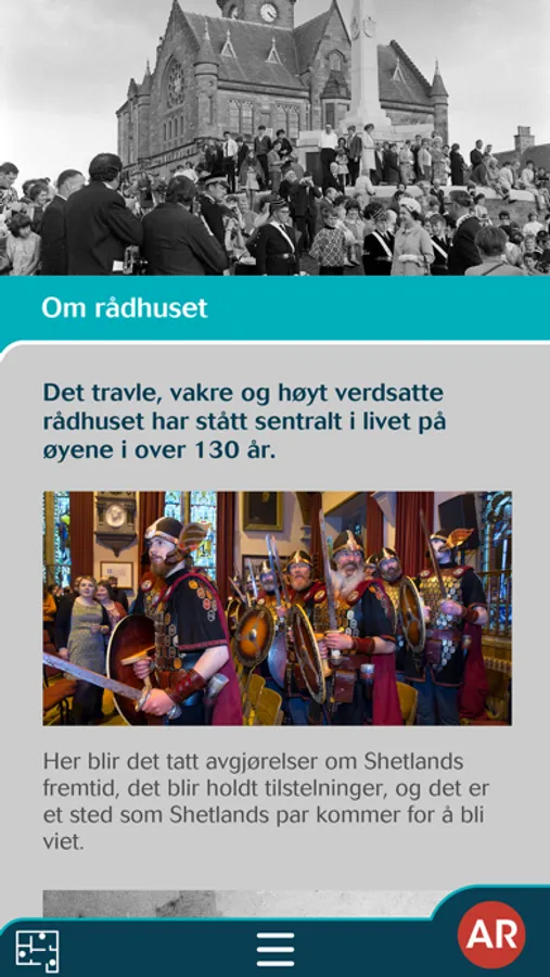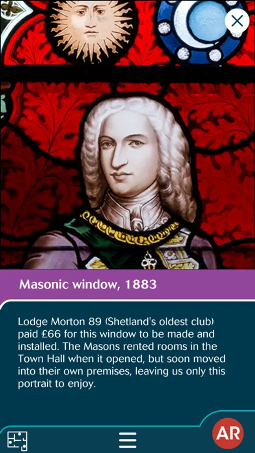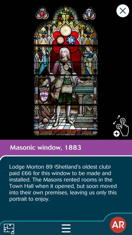 Busy, beautiful and much loved, Lerwick Town Hall has been at the centre of Island life for more than 130 years. With this app you can explore the Town Hall and, with Augmented Reality, meet virtual tour guides, seven year old Margaret, the Maid of Norway, and Arthur Laurenson, the man behind the magnificent stained-glass windows, who will guide you through Lerwick’s colourful history as depicted in the beautiful windows in English and Norwegian.
