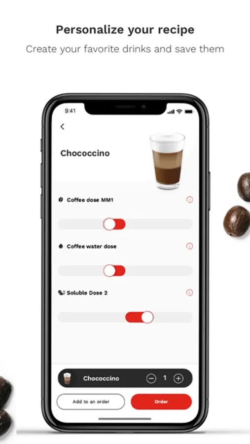 The application allows you to make your own cup of coffee, including in combination with milk and/or chocolate at a bar or in the office. With a simple touch, you can decide on the ratio between coffee and milk, coffee intensity, milk emulsion and much more. Just create your own recipe, save it on your smartphone or tablet and request it from the coffee machine as often as you want or share it with friends.
