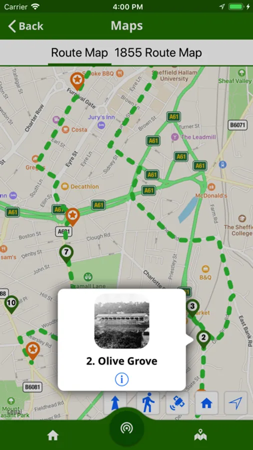 The app includes audio commentaries, so that you can listen as you walk or simply sit and enjoy in your armchair. As you reach key points along the walk content in the app will be triggered automatically. You will also be able to follow your location on an 1855 map, which will give you a sense of what Sheffield was like at that time.