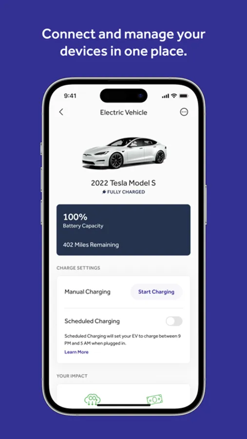 • Link your electric vehicle (Tesla, Jaguar I-Pace, Ford Mustang Mach-E), Nest Thermostat*, and Enphase Solar accounts
