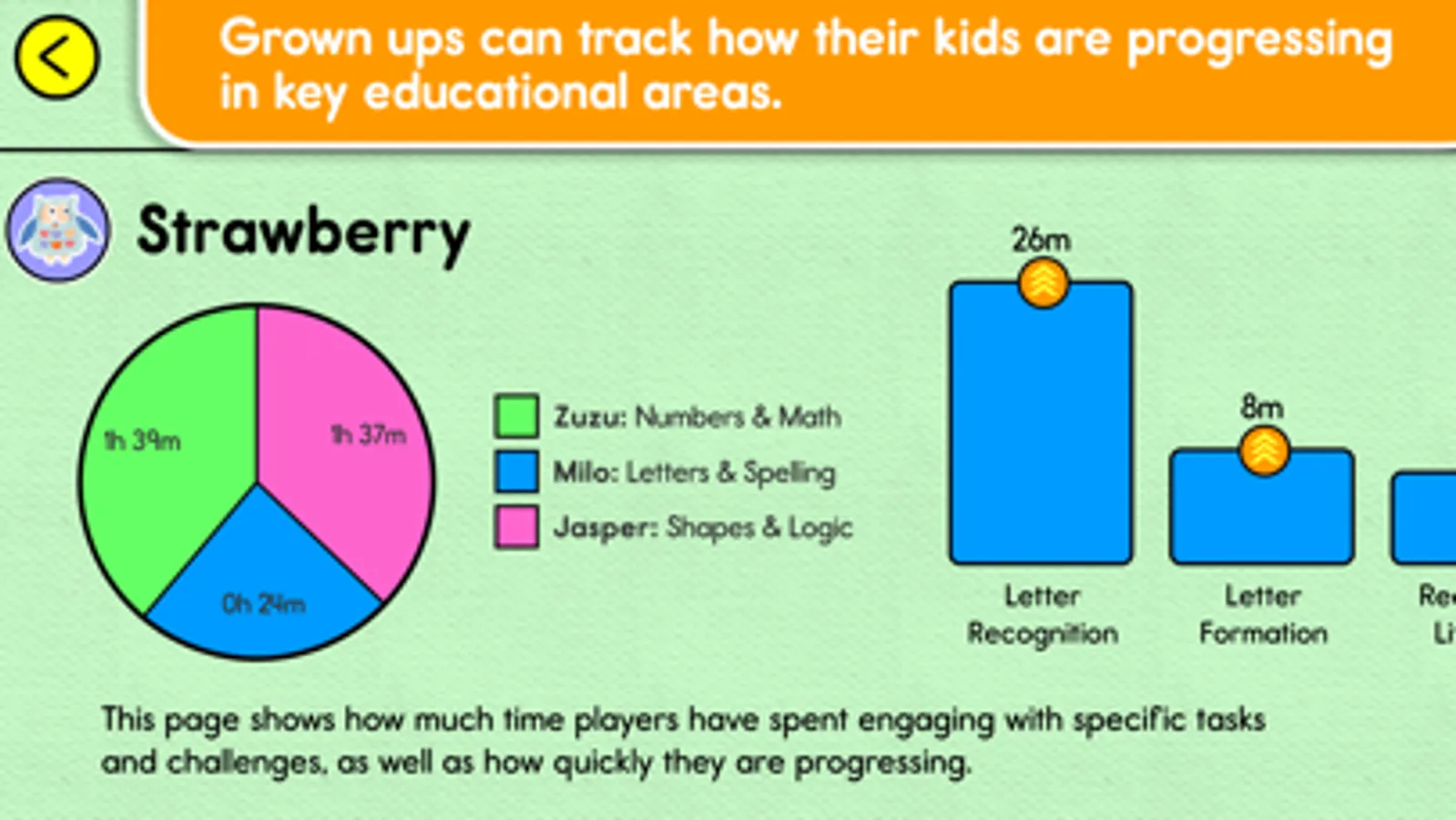 • Dedicated “grown ups” section lets you see how and what your kids are learning.