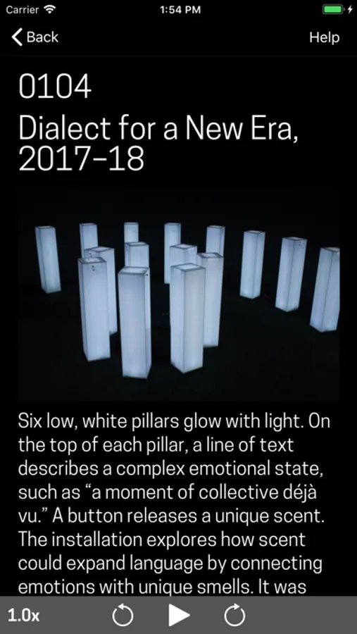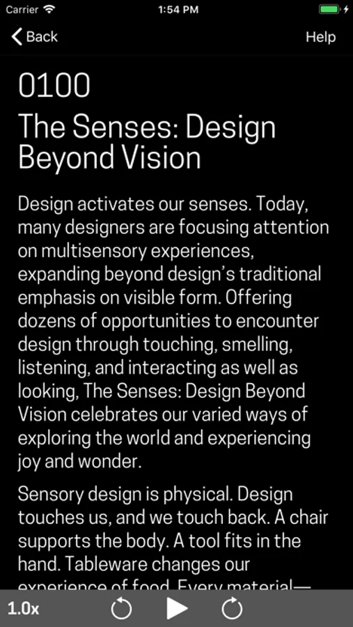 Use this app to access descriptive and interpretive content in streaming text and audio formats for Cooper Hewitt exhibitions. A visitor can enter a content number and choose to read the text, hear it with a screen reader, or listen to an audio recording. The content number entry will also deliver videos and images with accompanying verbal descriptions.